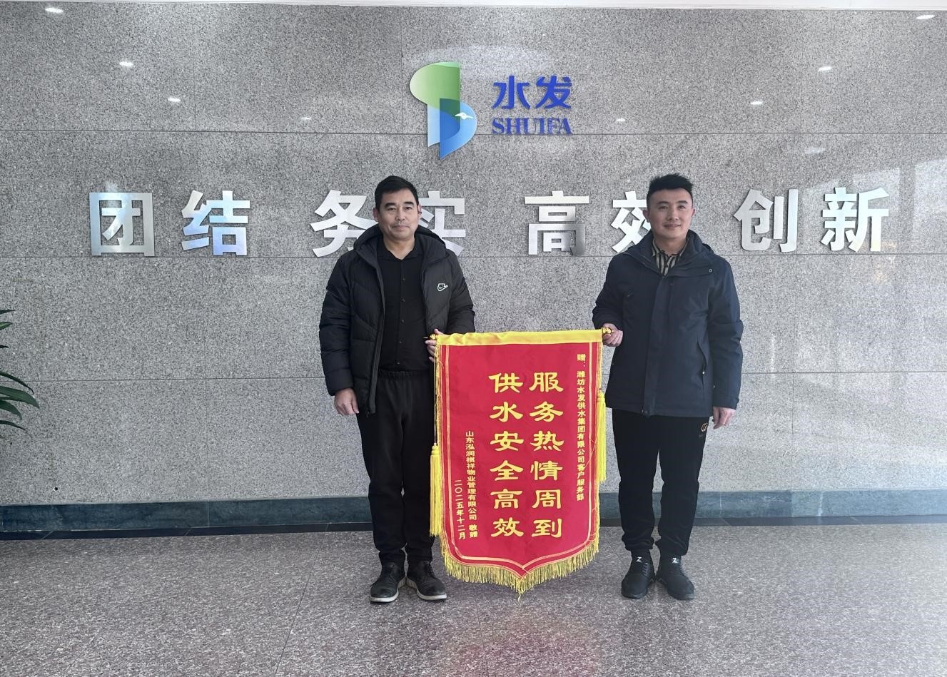 2025年 12月8日,濰坊水發(fā)供水集團有限公司客服部迎來了特殊的客人,合作物業(yè)代表將一面印有 “服務熱情周到 供水安全高效” 的鮮紅錦旗鄭重遞交到客服團隊手中,以最質樸的方式,表達對供水服務的由衷感激。